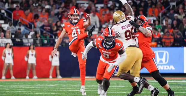 Big legs run in the Stonehouse family — Jack Stonehouse’s cousin, Ryan, leads the NFL in punting average for the Tennessee Titans. Syracuse’s Stonehouse ranked ninth nationally in punting average and second in the ACC by a narrow margin.